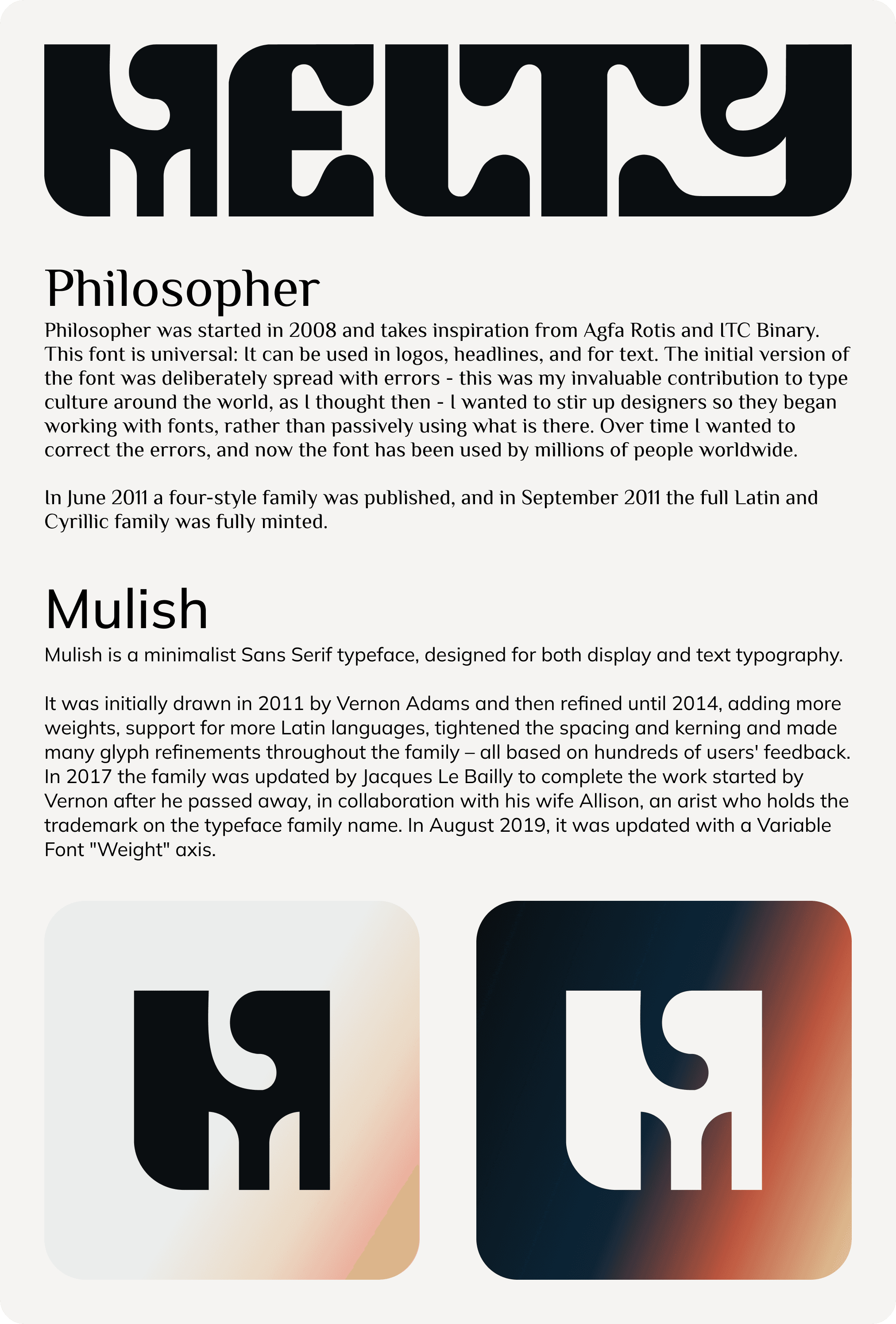 I toiled for a while trying to find a typeface that carried the full vibe of the brand while also being suitable for use as a paragraph font. Ultimately I decided to build my own font for the brandmark where I could add a bit more flourish and then curate web font's to support that direction; bringing better utility to the table.
