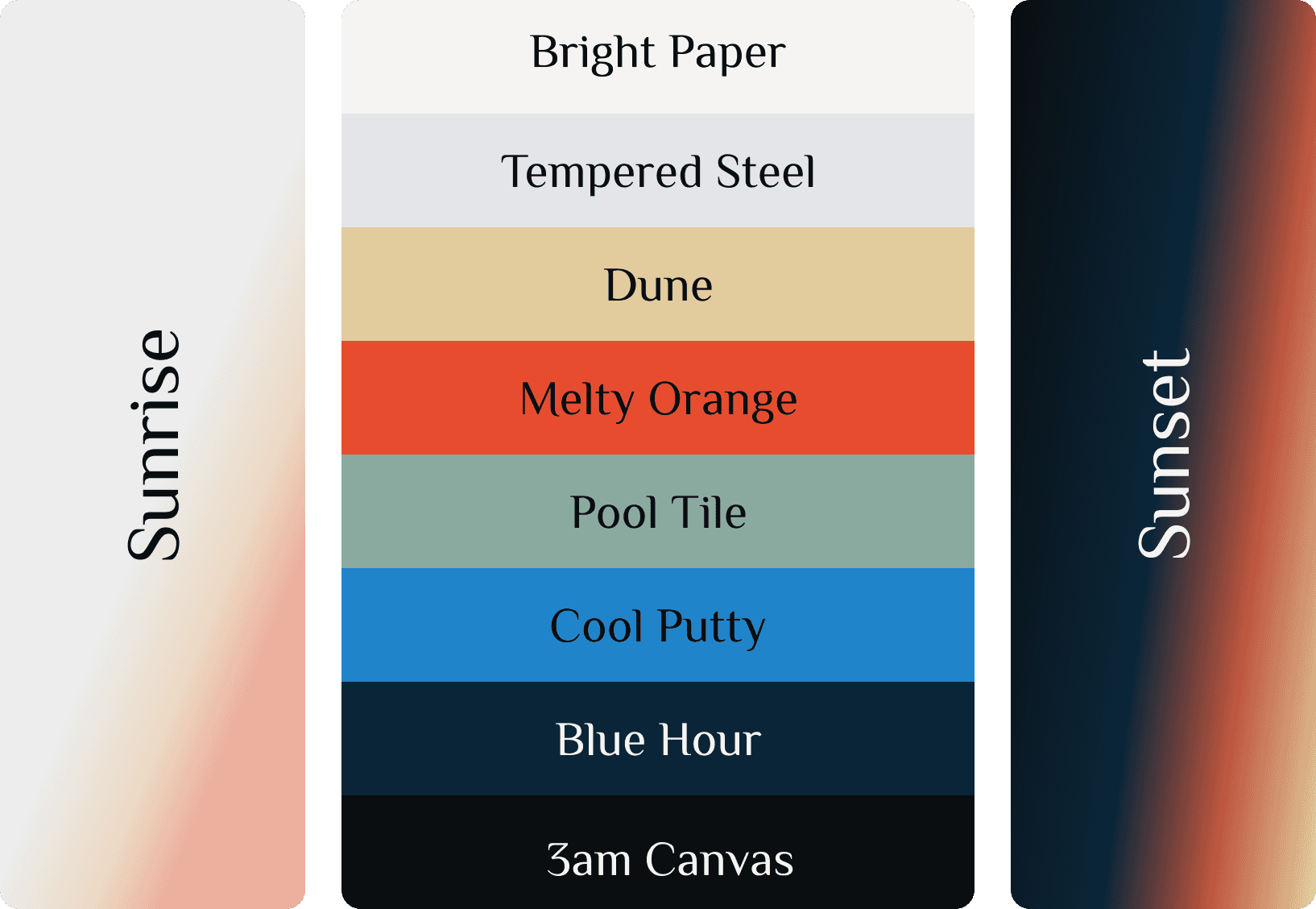 Another reason I like doing things this way is because a curated set of media makes defining a colour palette much more straightforward. Pulling from the above the colour palette below was born. I also crafted a couple custom gradients (one light and one dark) to mimic the natural falloff of colour and reinforce the Melty philosophy.